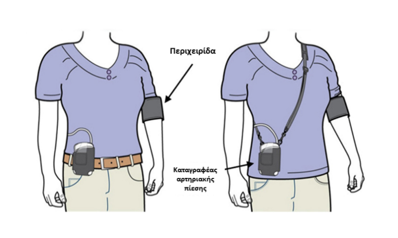 Η 24ωρη καταγραφή της αρτηριακής πίεσης γίνεται με τη βοήθεια μιας καταγραφικής συσκευής μεγέθους όσο ένα φορητό κασετοφωνάκι, η οποία συνδέεται με μια περιχειρίδα που τοποθετείται στο βραχίονα του ασθενούς. Η περιχειρίδα φουσκώνει και ξεφουσκώνει ανά τακτά χρονικά διαστήματα και οι μετρήσεις της αρτηριακής πίεσης αποθηκεύονται στην καταγραφική συσκευή (Εικόνα 1).